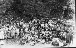 ![]() Una donna contadina di Storo, anni 1960 circa. | ![]() Montagna di Storo fine anni 30, cava di “barite” della SIGMA, il gruppo dei minatori tra i quali due membri della famiglia Sai. | ![]() Storo 1950, Francesco (Chechì) Grassi-Òe col suo bue, dietro il figlio Pietro (Perolì) con sua moglie Martina e i figli Francesco (Ceschino), Bruno e Anna. |
