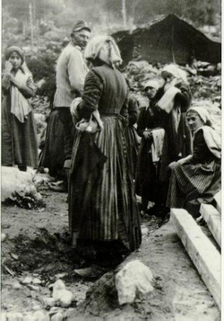 ![]() Storo 1907, prima pagina della carta di dote di Elisabetta Sai di Marco, sposata con Giovanni Scaglia Scàce. | ![]() Storo, anni 1960 circa: donne dell’ultima generazione che conobbero la carta di dote. | ![]() 1930, Caterina Zontini, vedova Mezzi, col secondo marito Romolo Bondoni. |